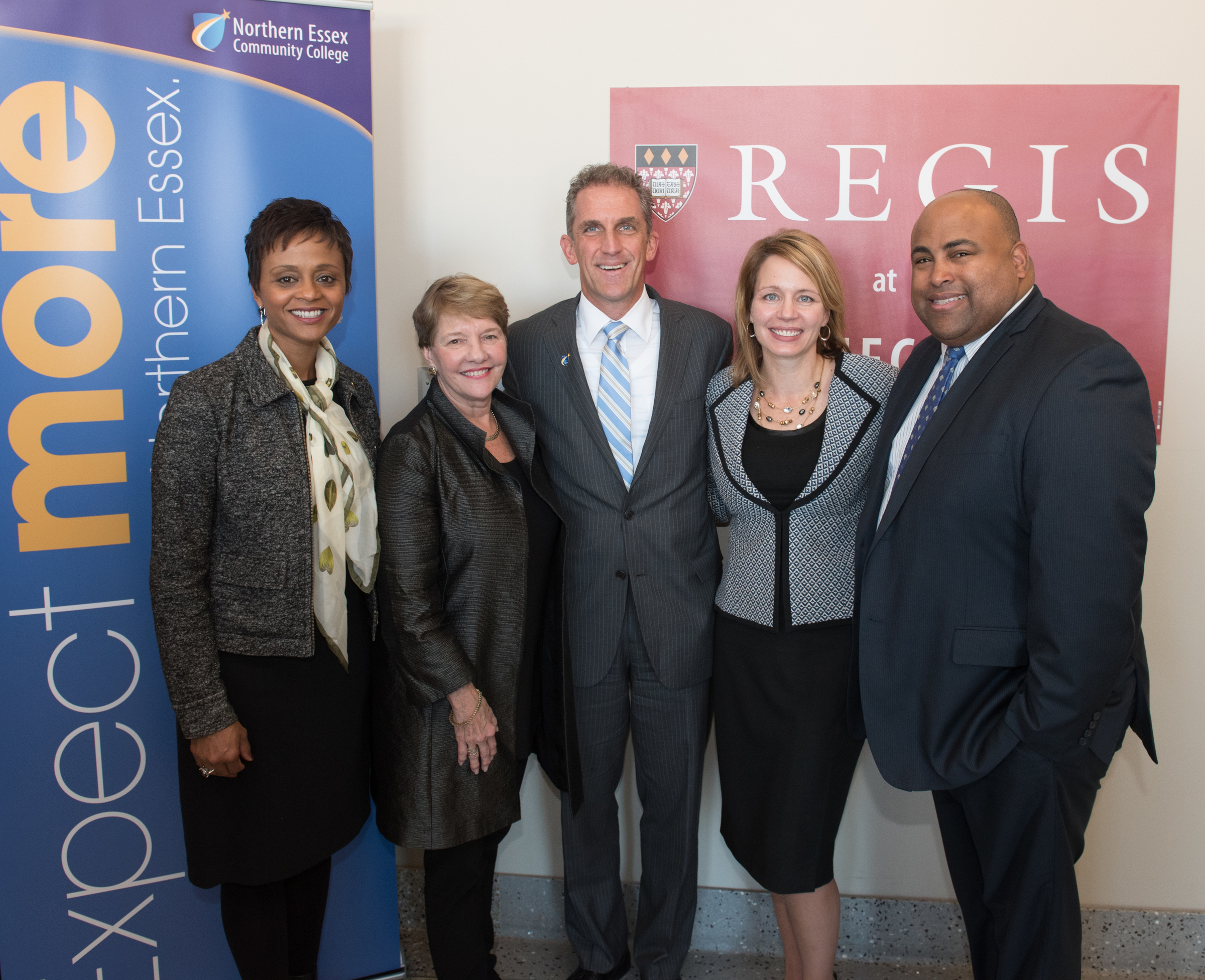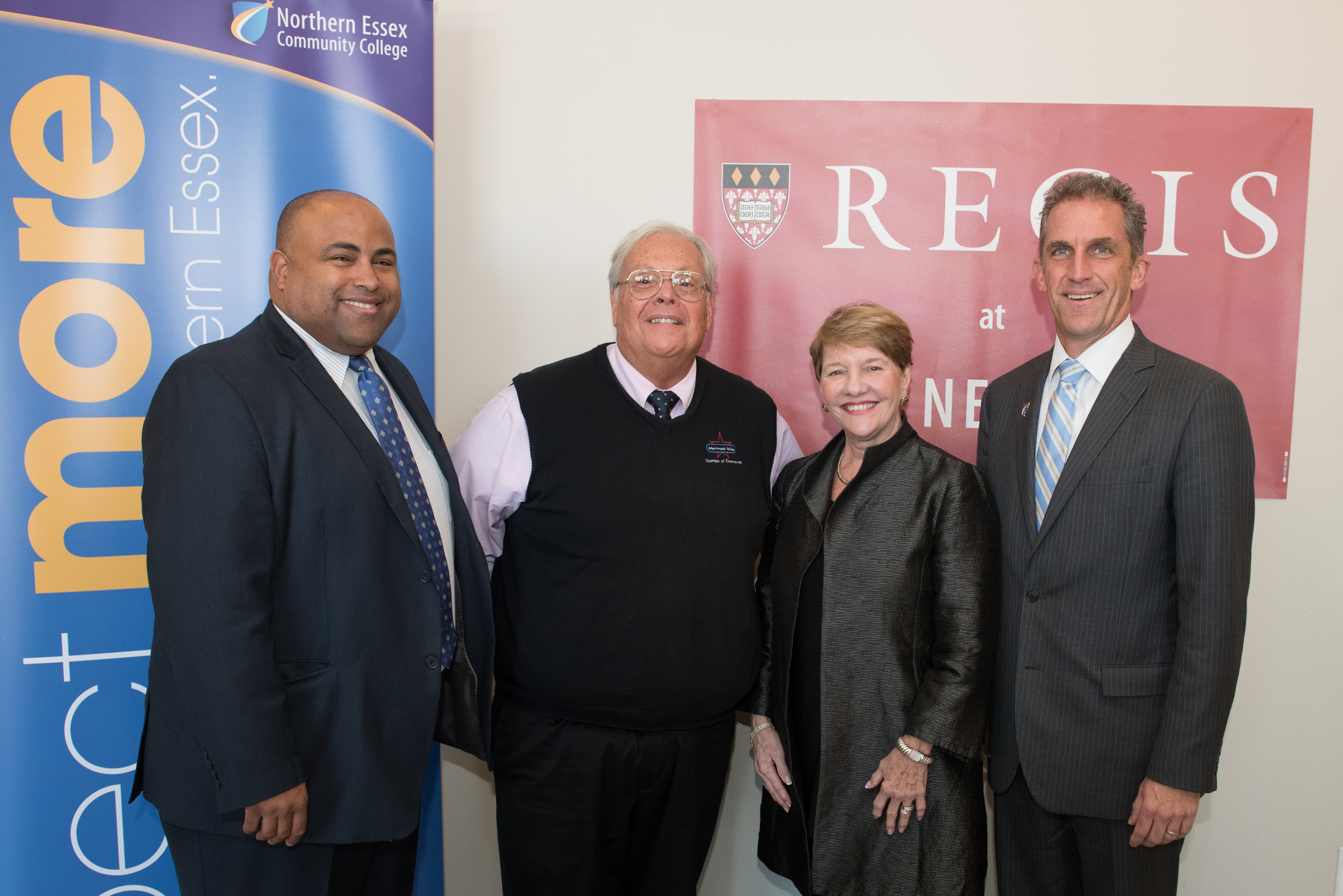 - Lawrence Mayor Dan Rivera, Joe Bevilacqua, Merrimack Valley Chamber of commerce, Toni Hays, Regis president, and Lane Glenn, NECC president.