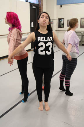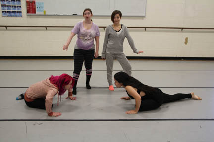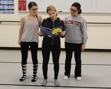 NECC dance students Katie Formosi of Groveland, Marissa Gagnon of Salem, NH, and Alyssa Foden of Methuen prepare their student choreographed piece titled “Moments” based on the children’s book “The Kissing Hand”.
