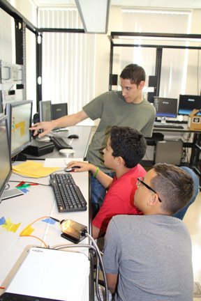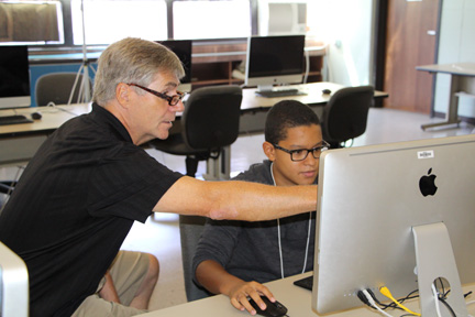 - Technology Camp instructor Jay Fallon helps out Emil Pinales-Santana of Methuen.