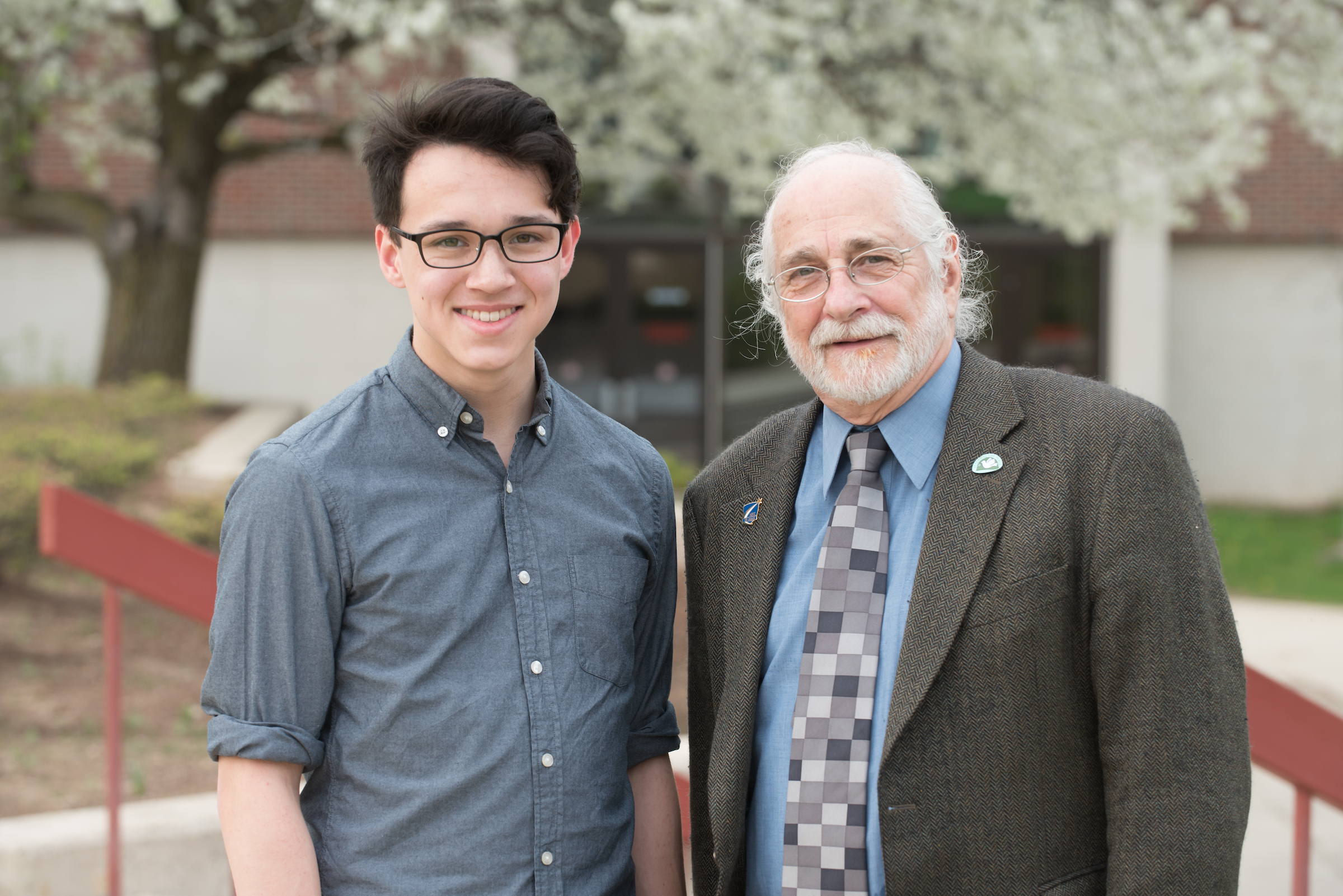 Dr. Paul Saint-Amand (rear center) is surrounded by the Peace Poetry winners. (front l to r) Julia Hutchinson, Malika Meskine, Nate Reily, Esra Cetin. (rear l to r) Jonathan Lovett, Saint-Amand, and Michelle Howard.