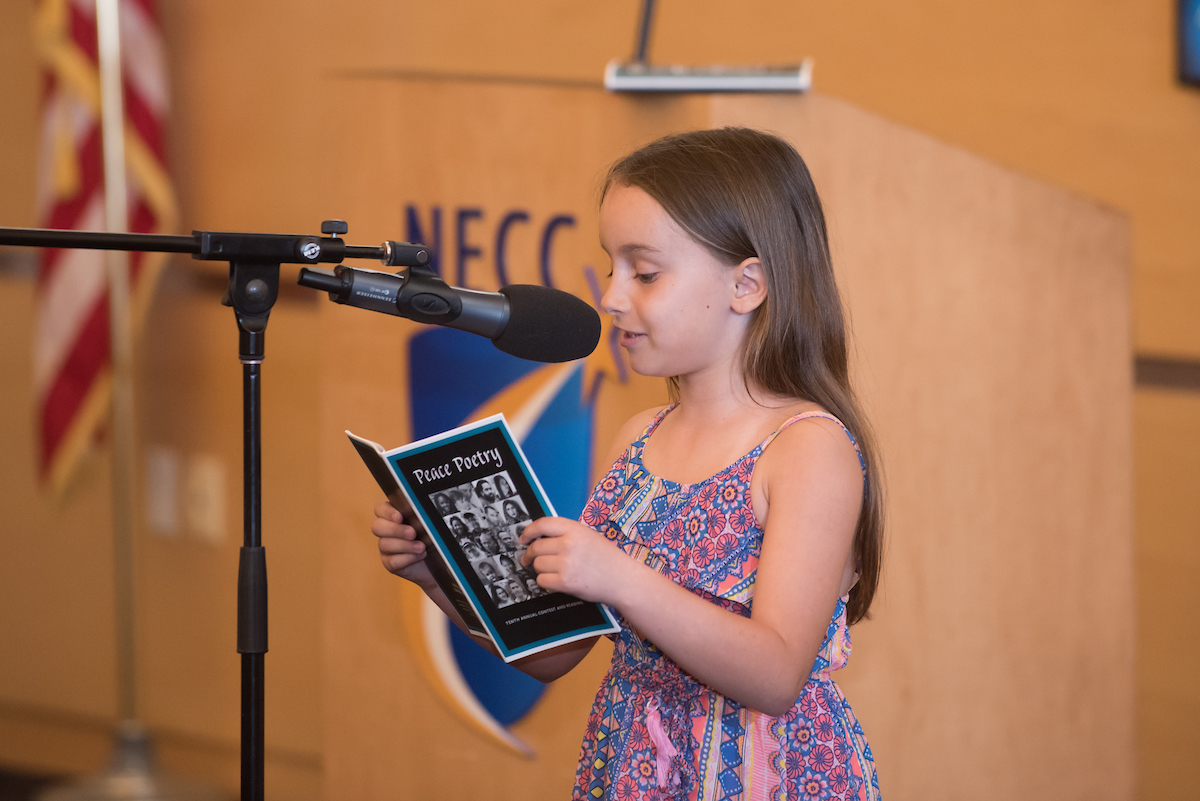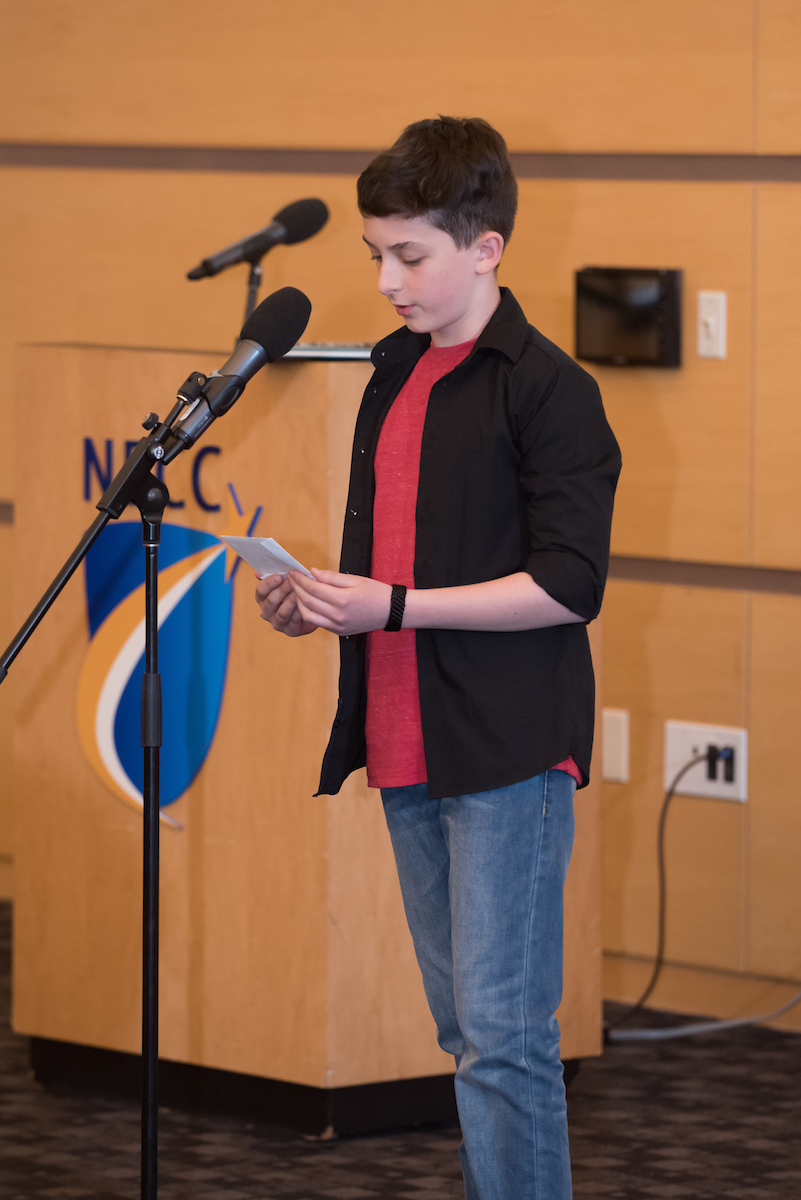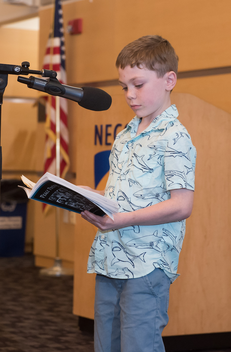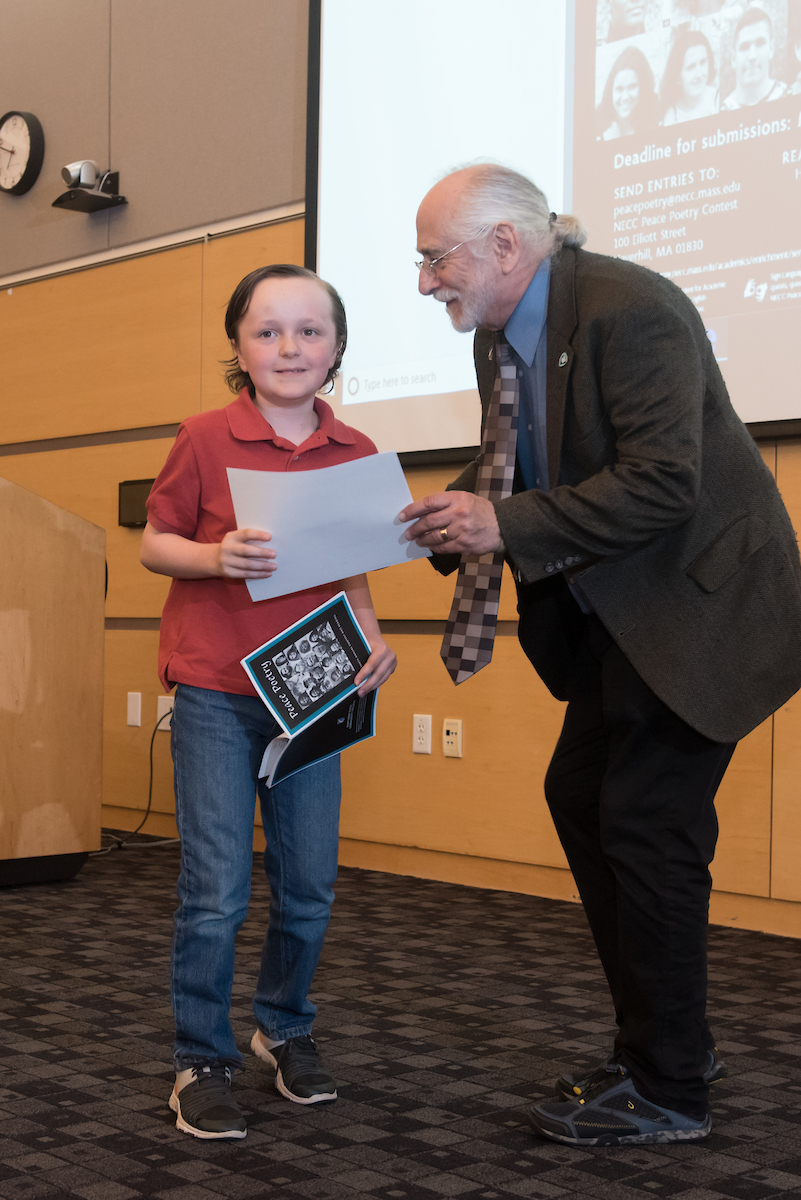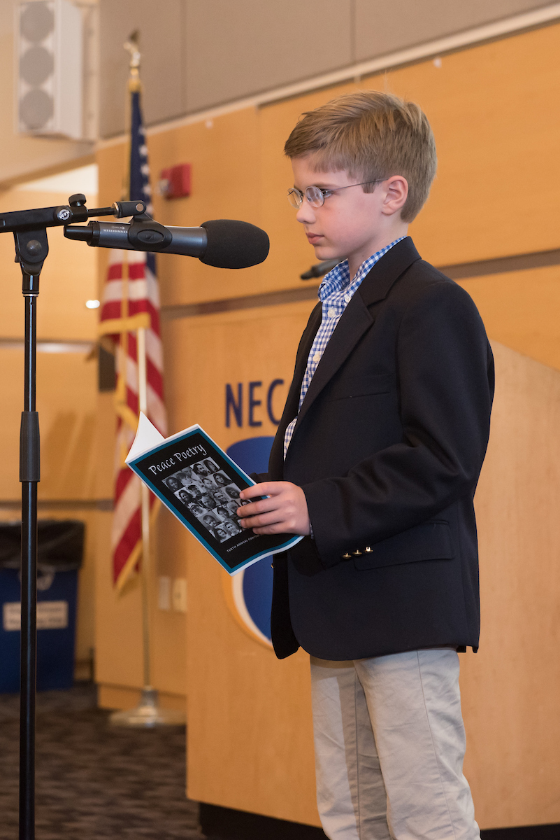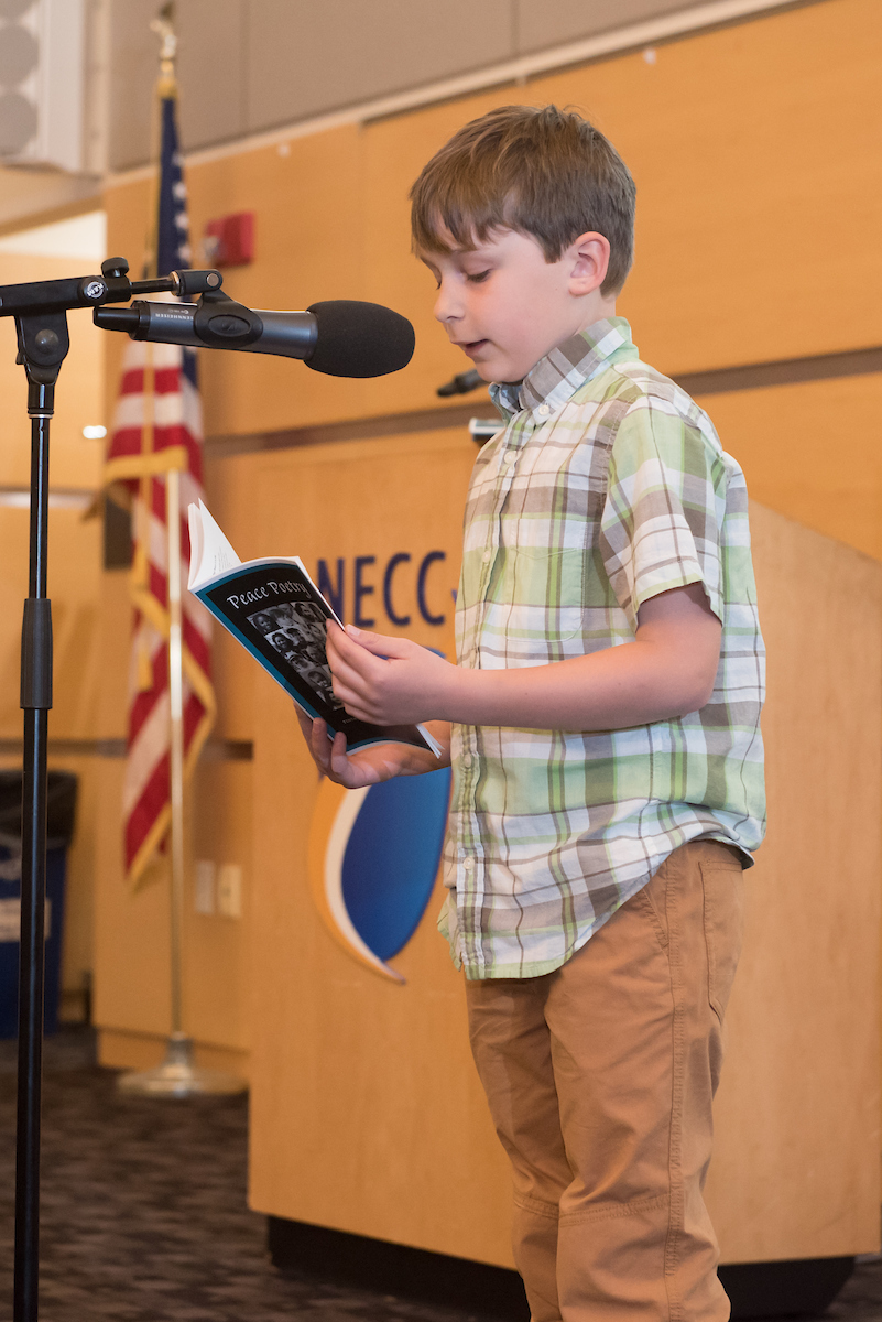 “Circle is the shape of love, and if you split it in thirds, it’s the symbol of peace and, when peace and love come together it becomes indestructible,” read Nathan Lagueux, a third-grader from the River Valley Charter School in Newburyport, during Northern Essex Community College’s 10th Peace Poetry Contest & Reading.