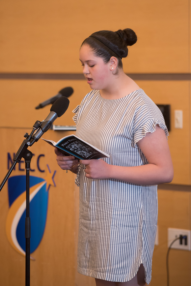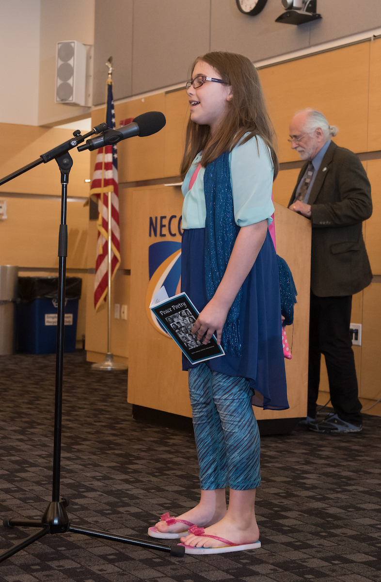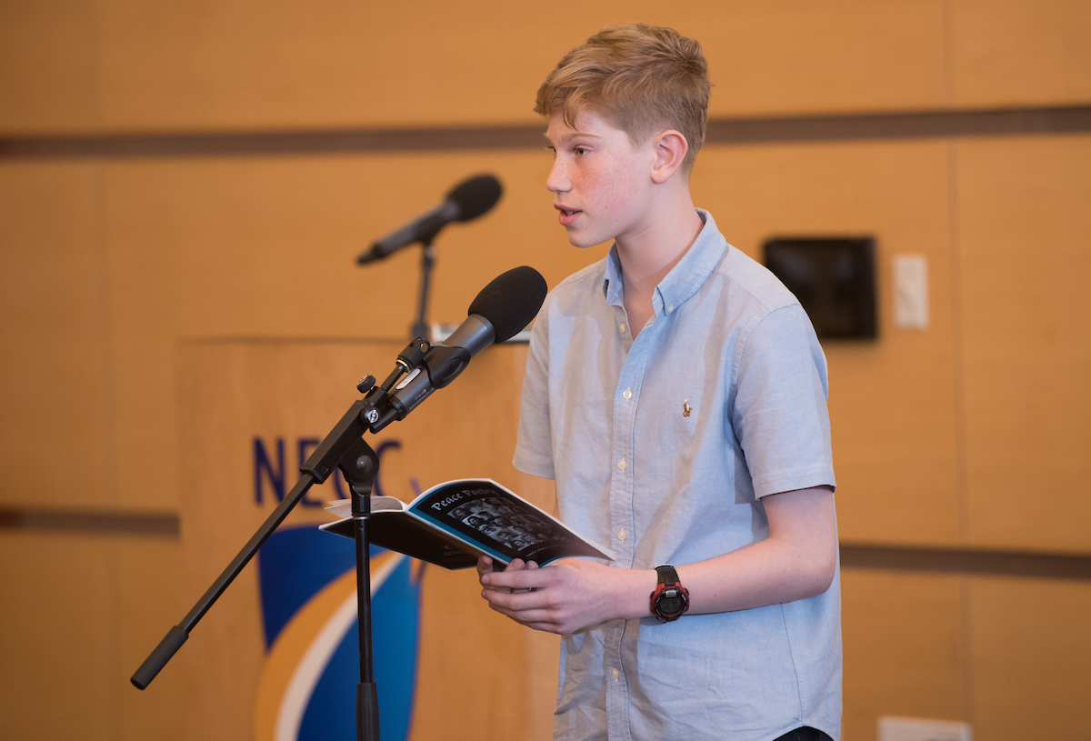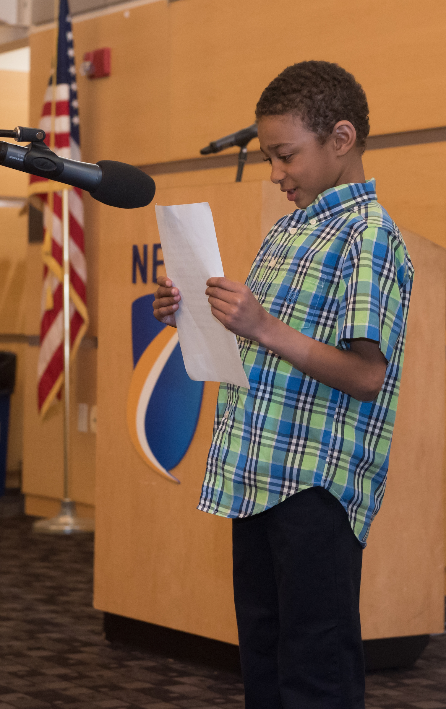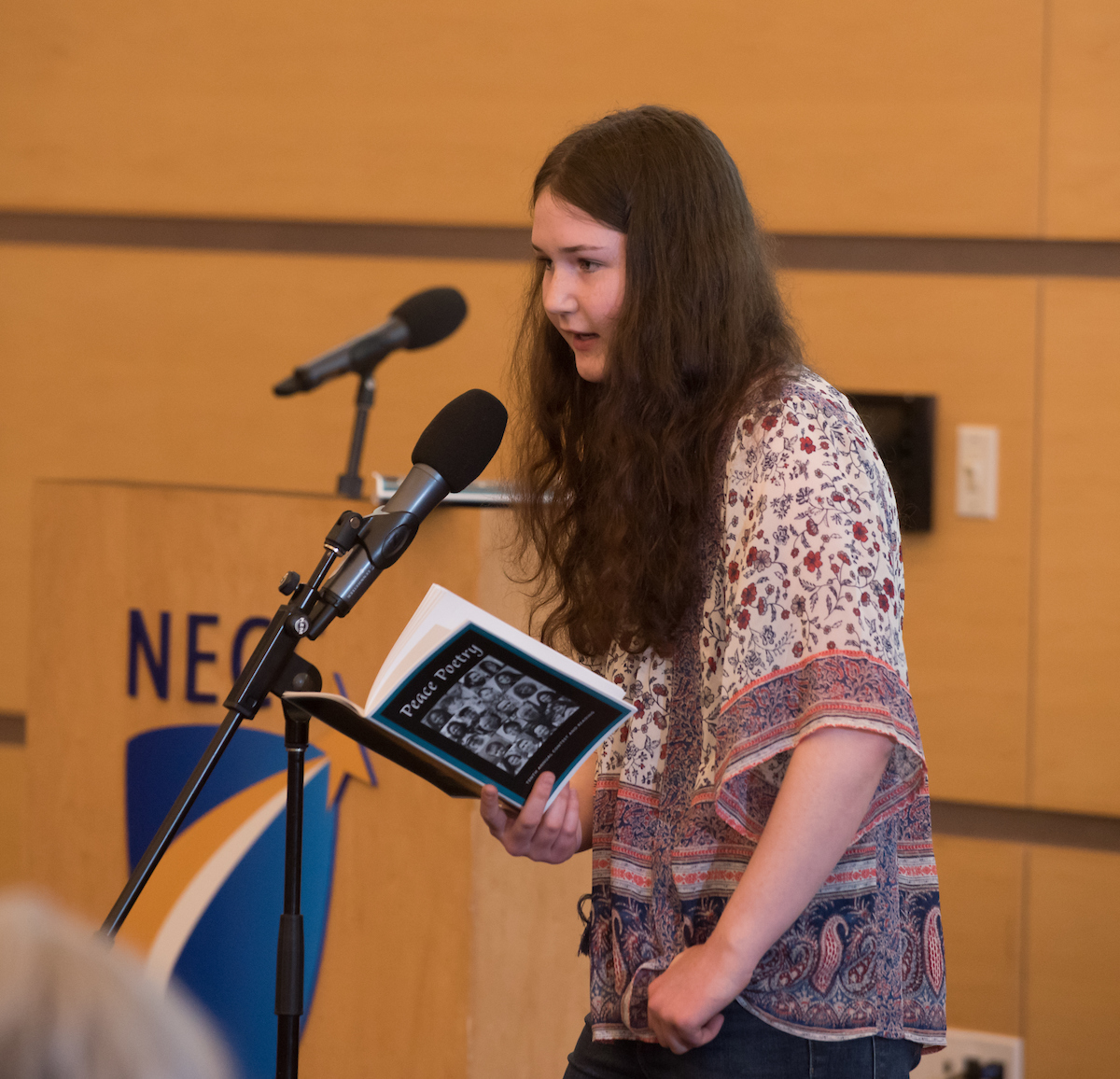 “Circle is the shape of love, and if you split it in thirds, it’s the symbol of peace and, when peace and love come together it becomes indestructible,” read Nathan Lagueux, a third-grader from the River Valley Charter School in Newburyport, during Northern Essex Community College’s 10th Peace Poetry Contest & Reading.