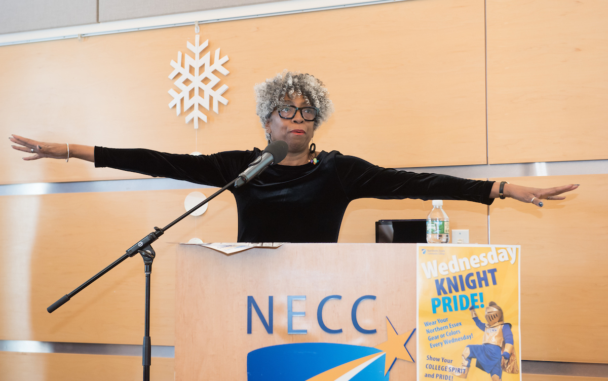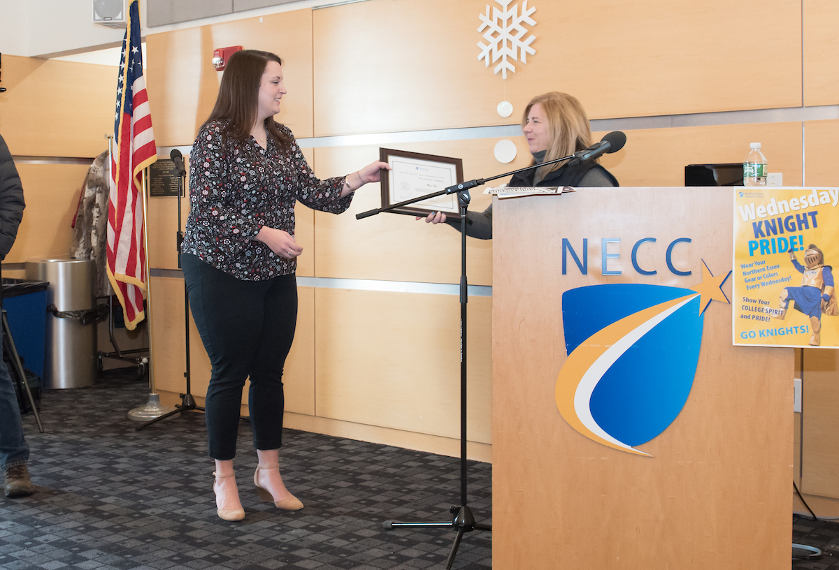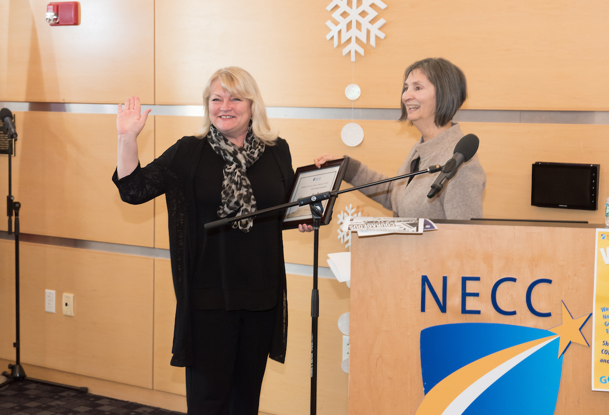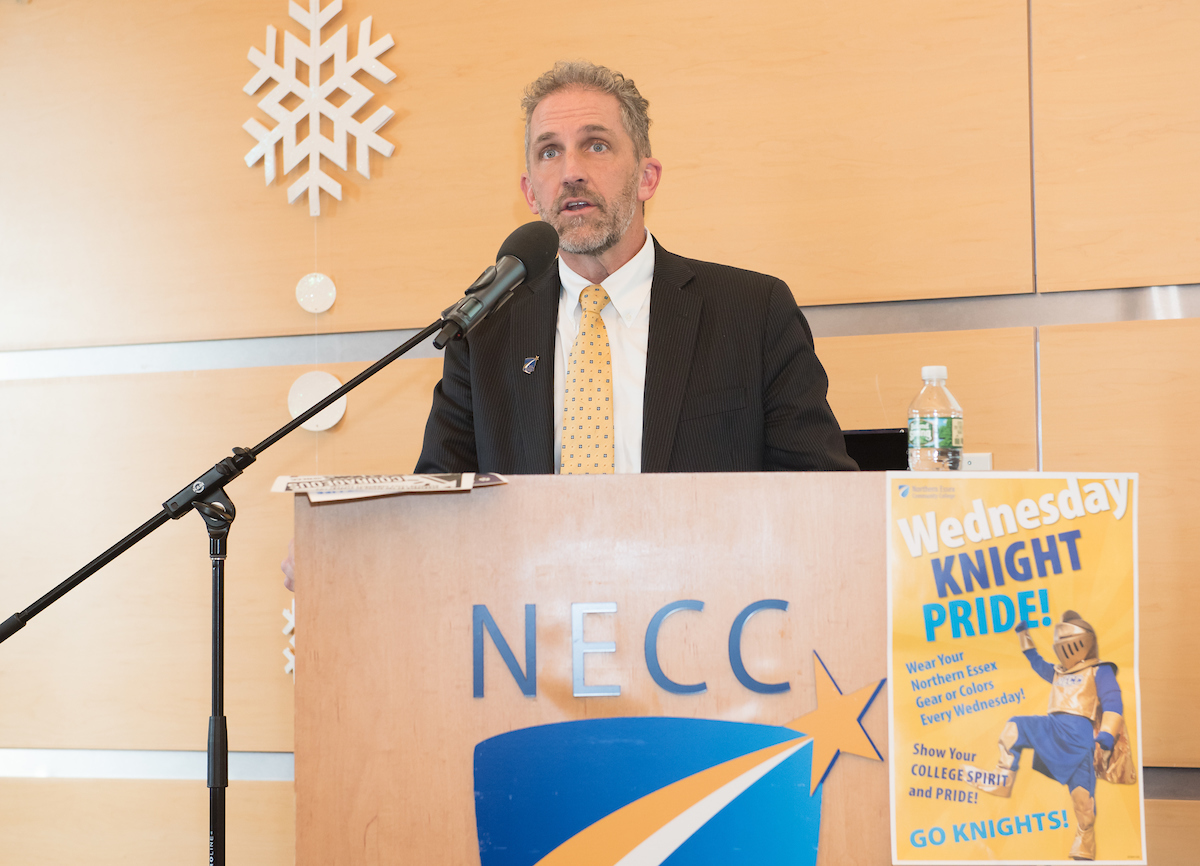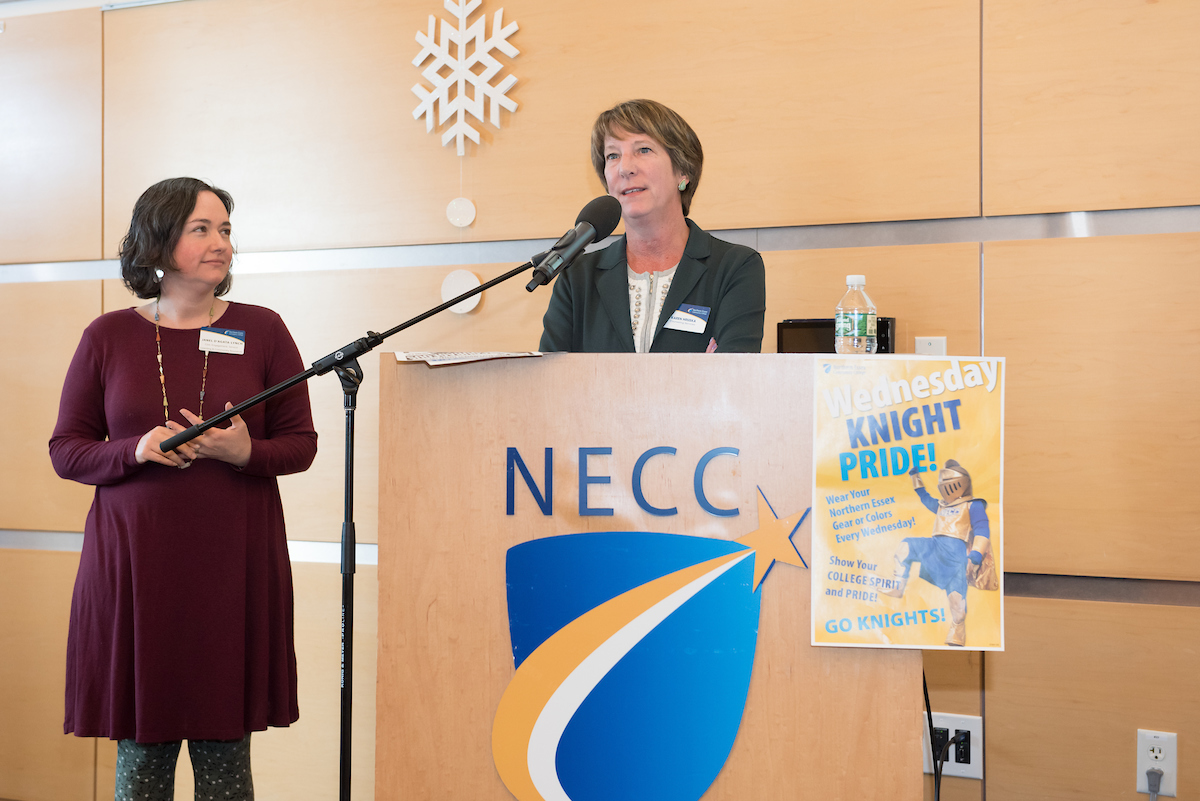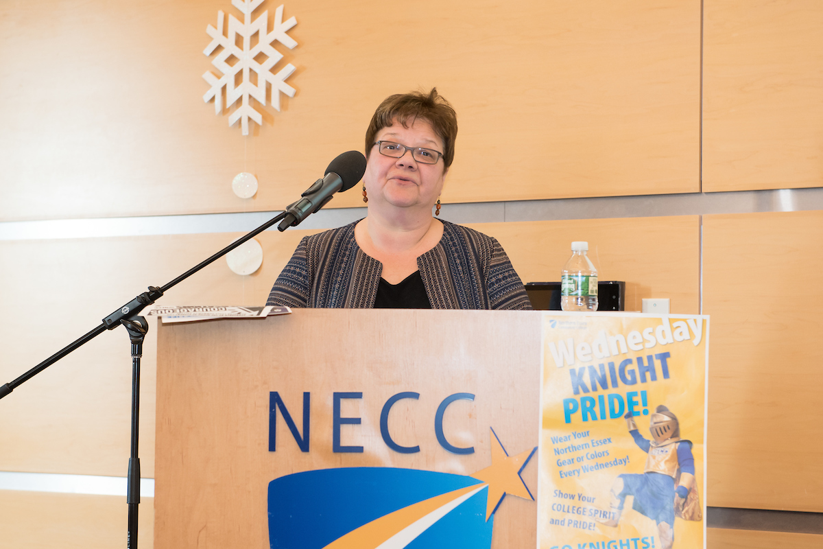 After introducing new hires, announcing retirements, and congratulating the NISOD recipients, President Lane Glenn introduced Linda Rohrer, director of MassHire Merrimack Valley Career Center, formally known as ValleyWorks Career Center. Northern Essex has managed the career center since spring of 2017. It now has locations in Haverhill and Lawrence. With the motto “Let’s Get to Work,” MassHire serves is a comprehensive career center that provides a wide range of services to job seekers and businesses, youth to adults in the Merrimack Valley.