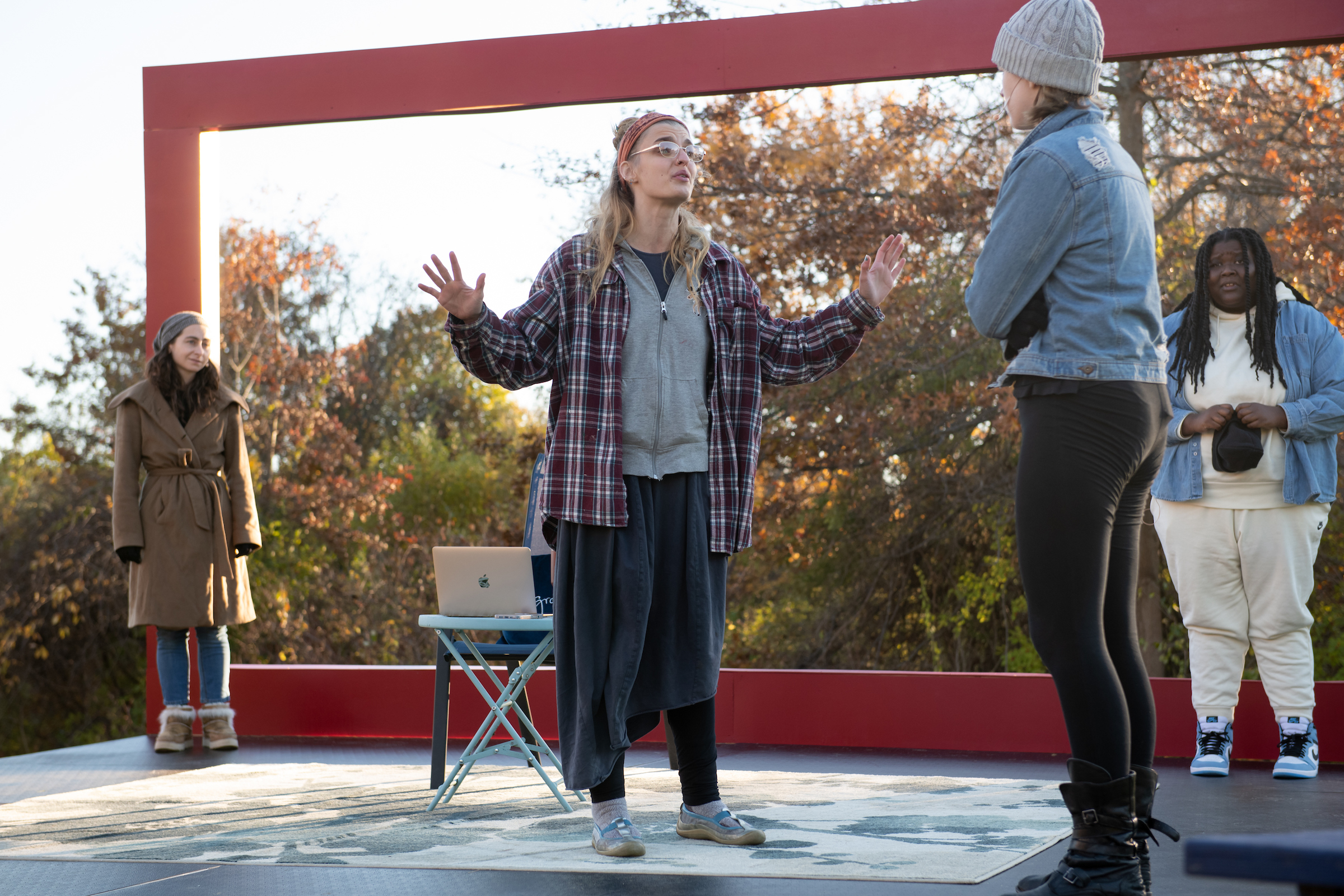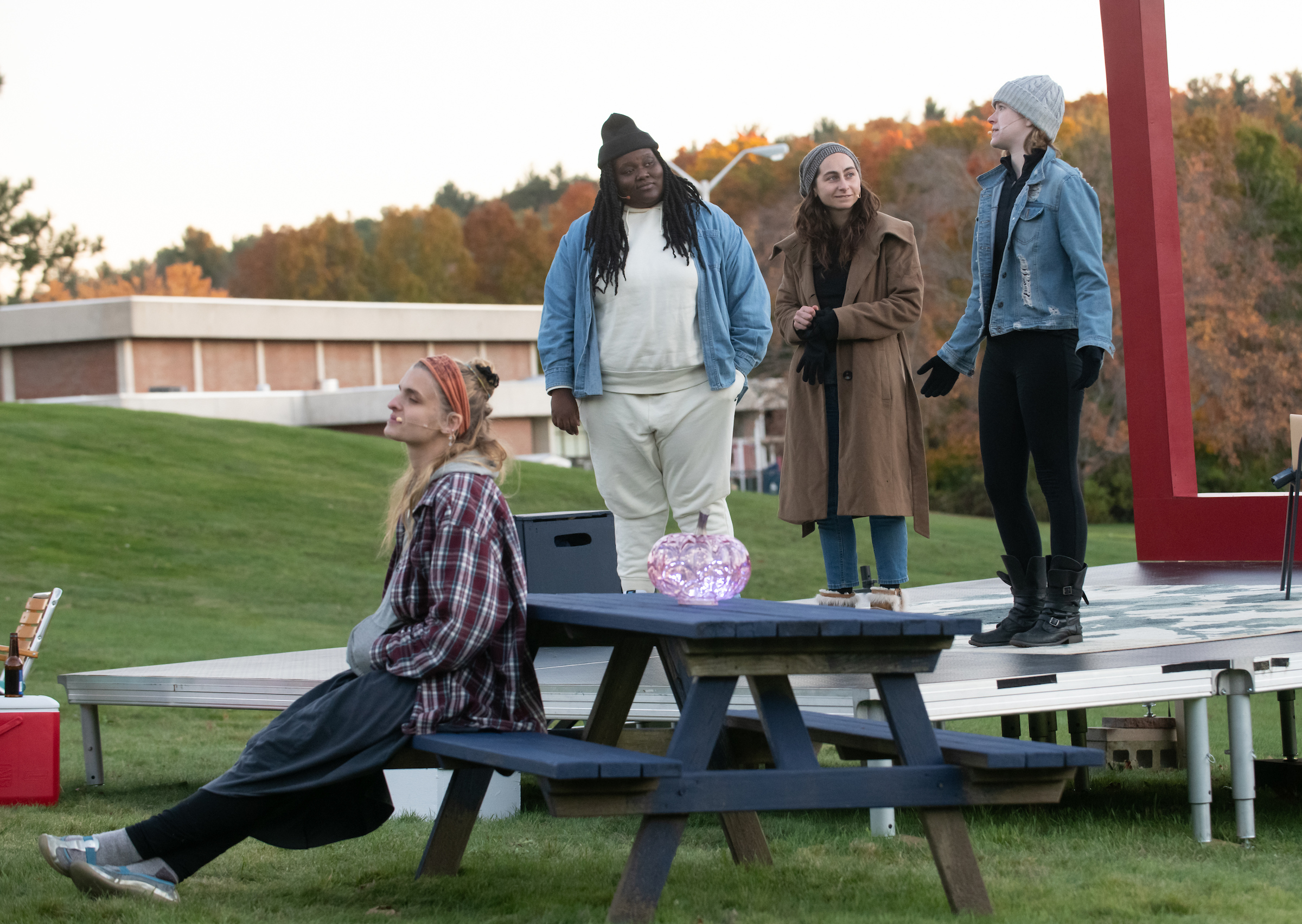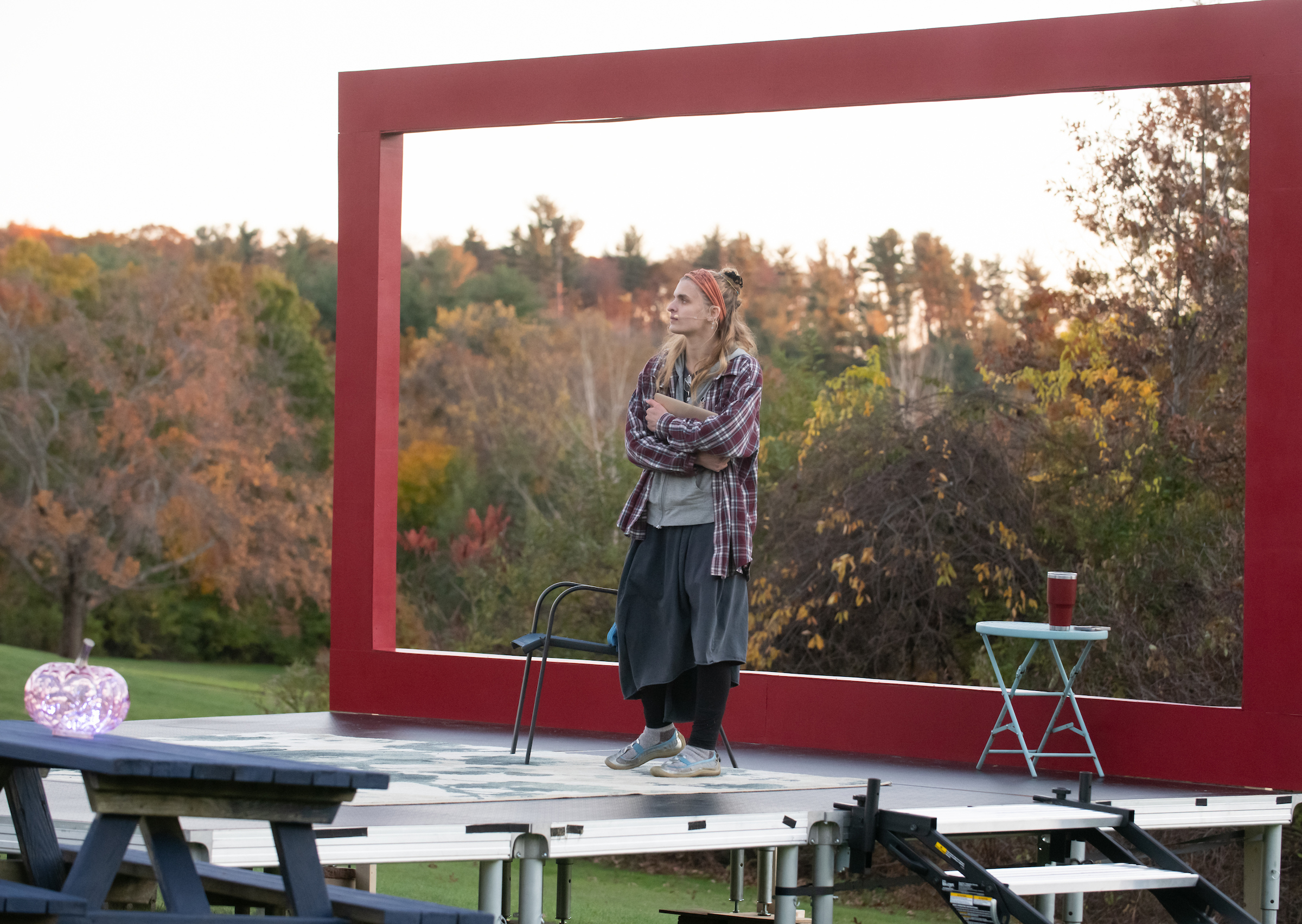 The actors adapted brilliantly to the outdoor setting, says Director Brianne Beatrice, performing under a simple stage framed in red with the campus’s late fall color as a backdrop.