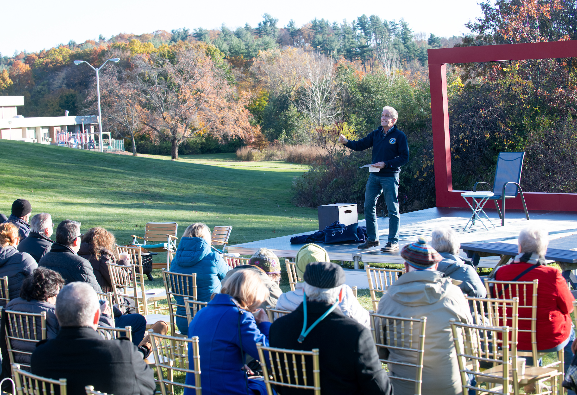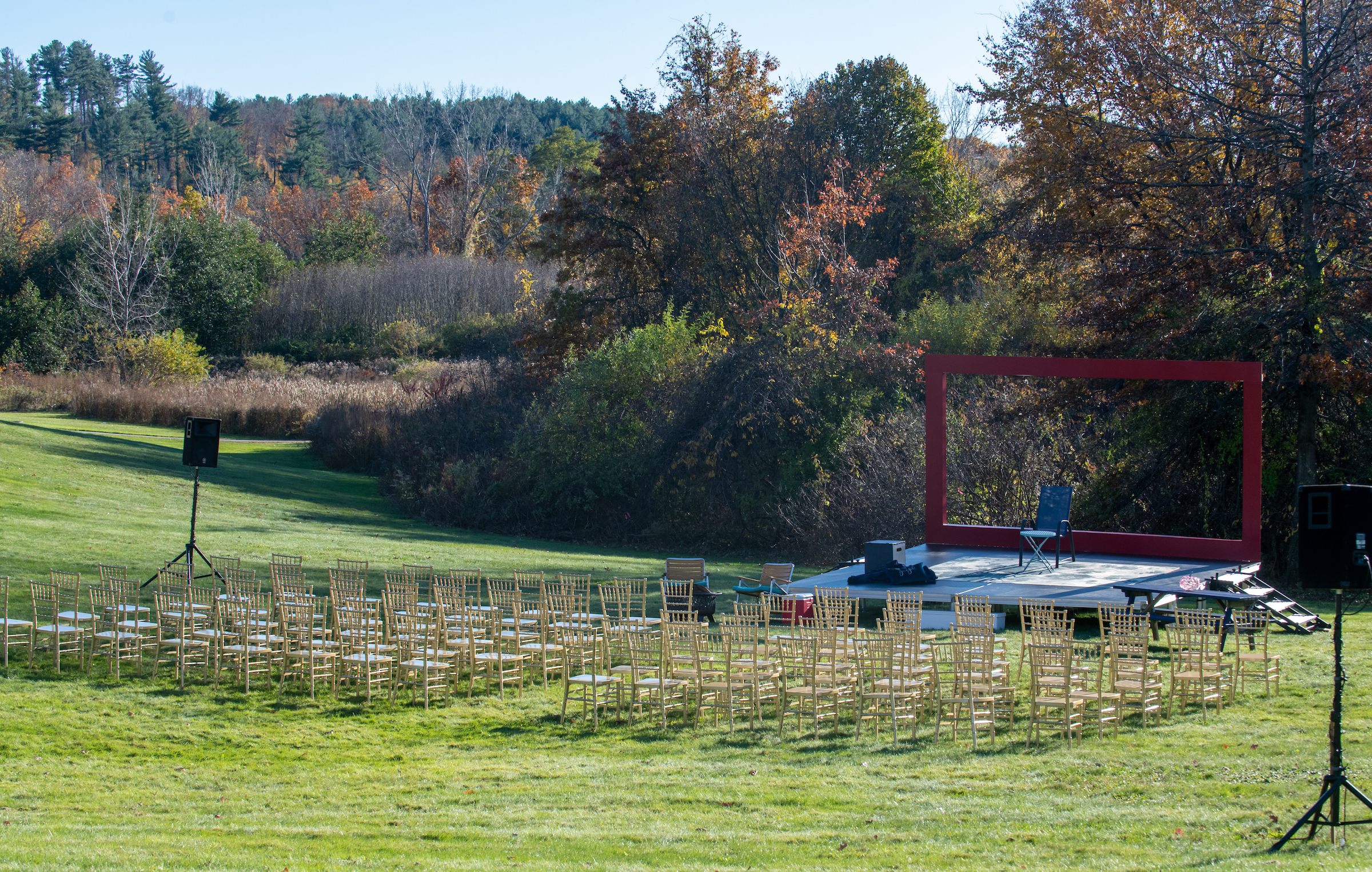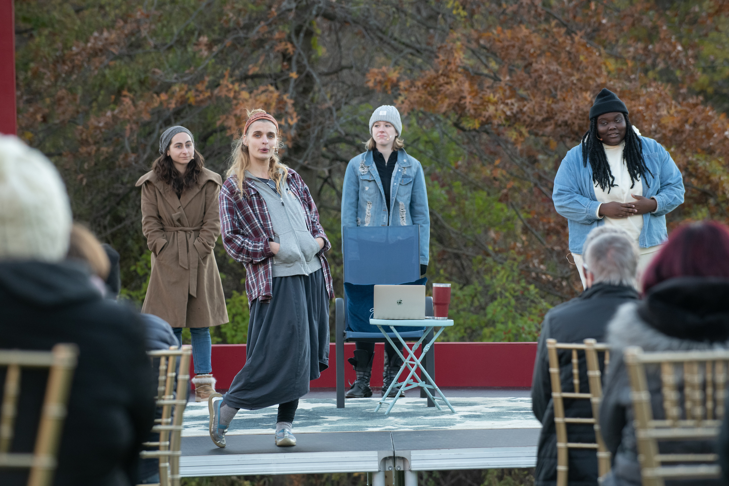 The actors adapted brilliantly to the outdoor setting, says Director Brianne Beatrice, performing under a simple stage framed in red with the campus’s late fall color as a backdrop.