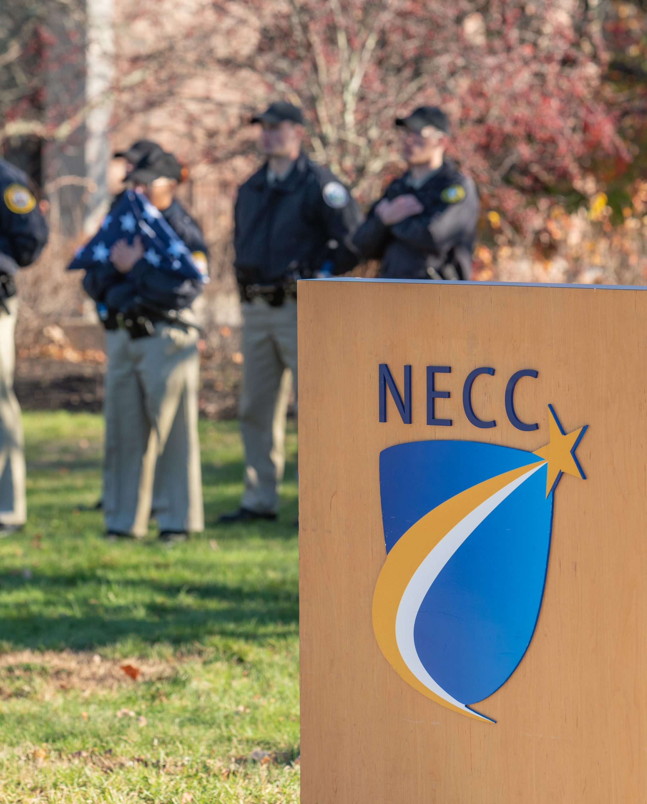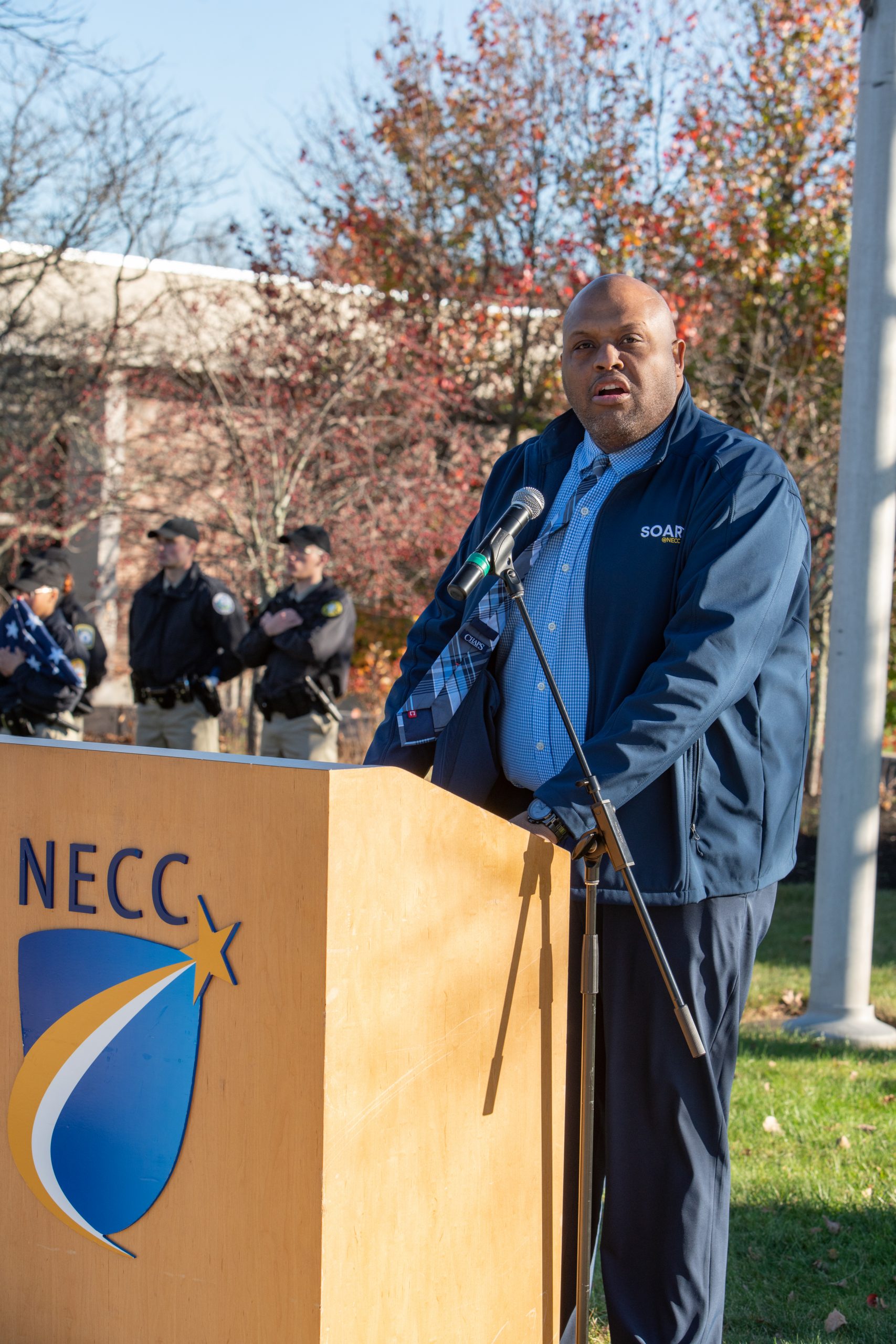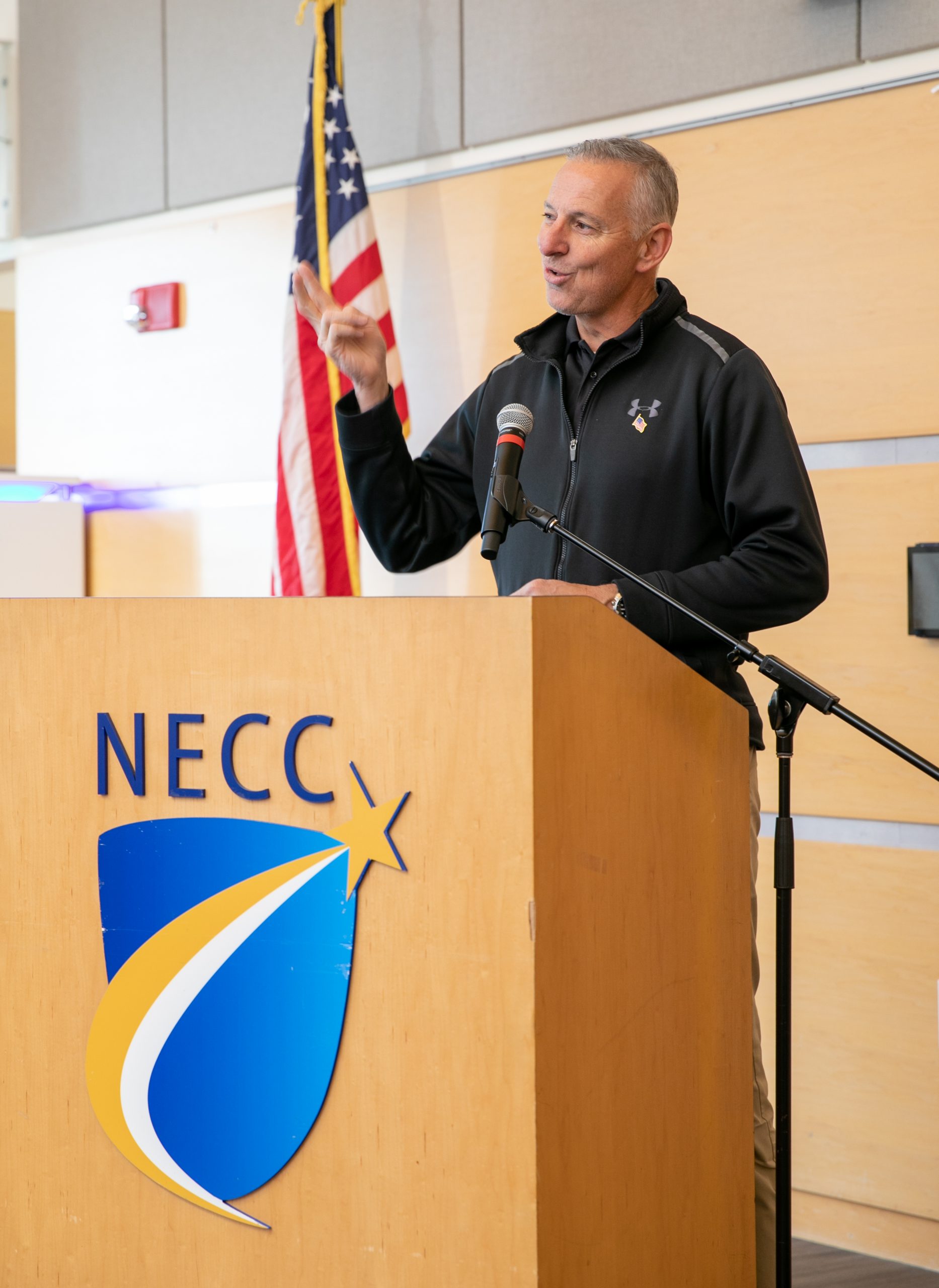 Dr. Paul Beaudin, NECC provost, reflected on the event’s significance to the NECC community. “Some 60 years ago, Massachusetts sons John F. Kennedy and poet Robert Frost gathered at our capitol in Washington for Kennedy’s inauguration. Frost previously had spoken on the merits of taking the road less traveled, and Kennedy advised, ‘Ask not what your country can do for you; ask what you can do for your country.’ At NECC, we are in the ‘dream business,’ encouraging students to pursue less traveled roads for themselves and their families. We know, too, that such dreaming is only possible because, like President Kennedy, Americans have asked, ‘What can I do for my country?’