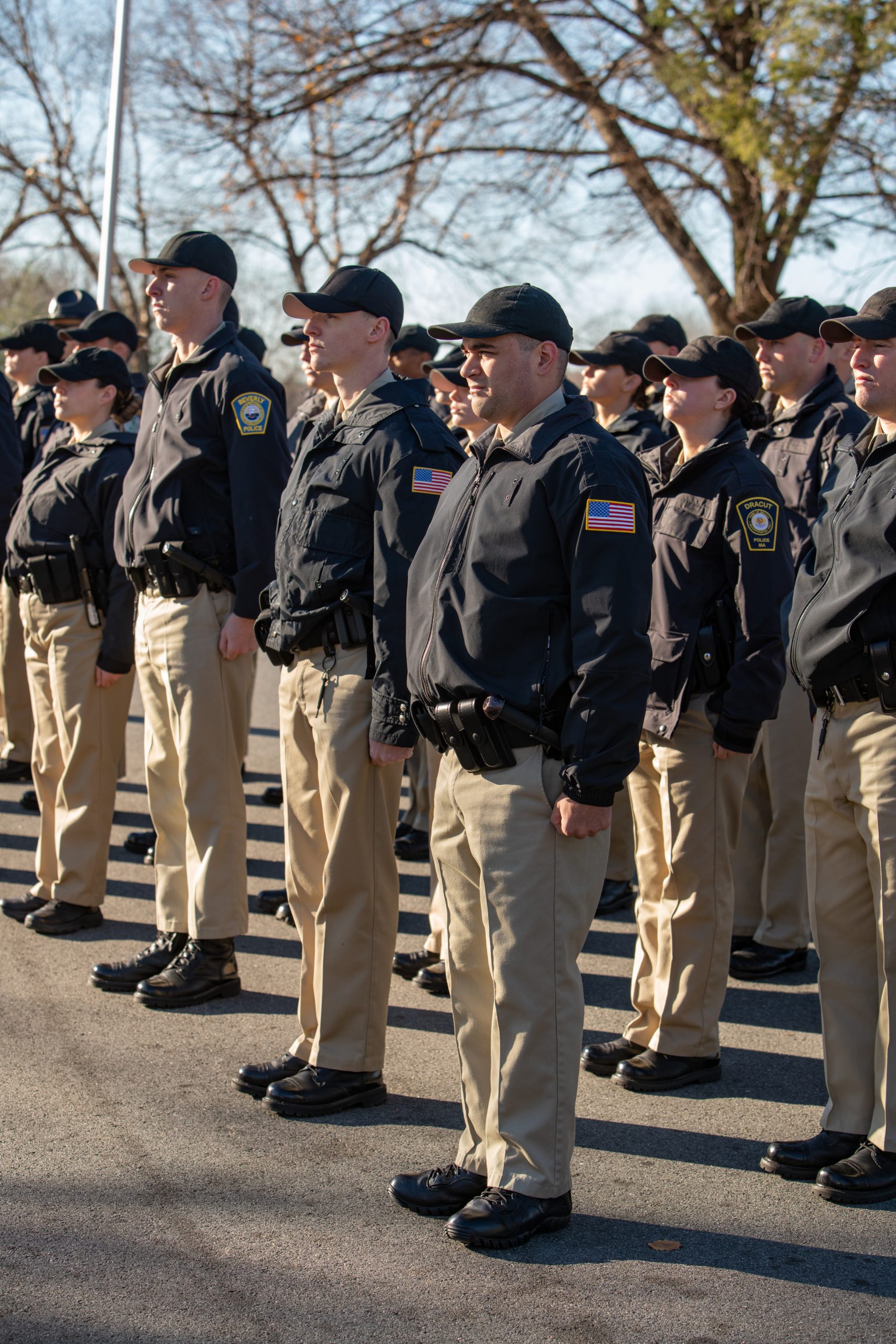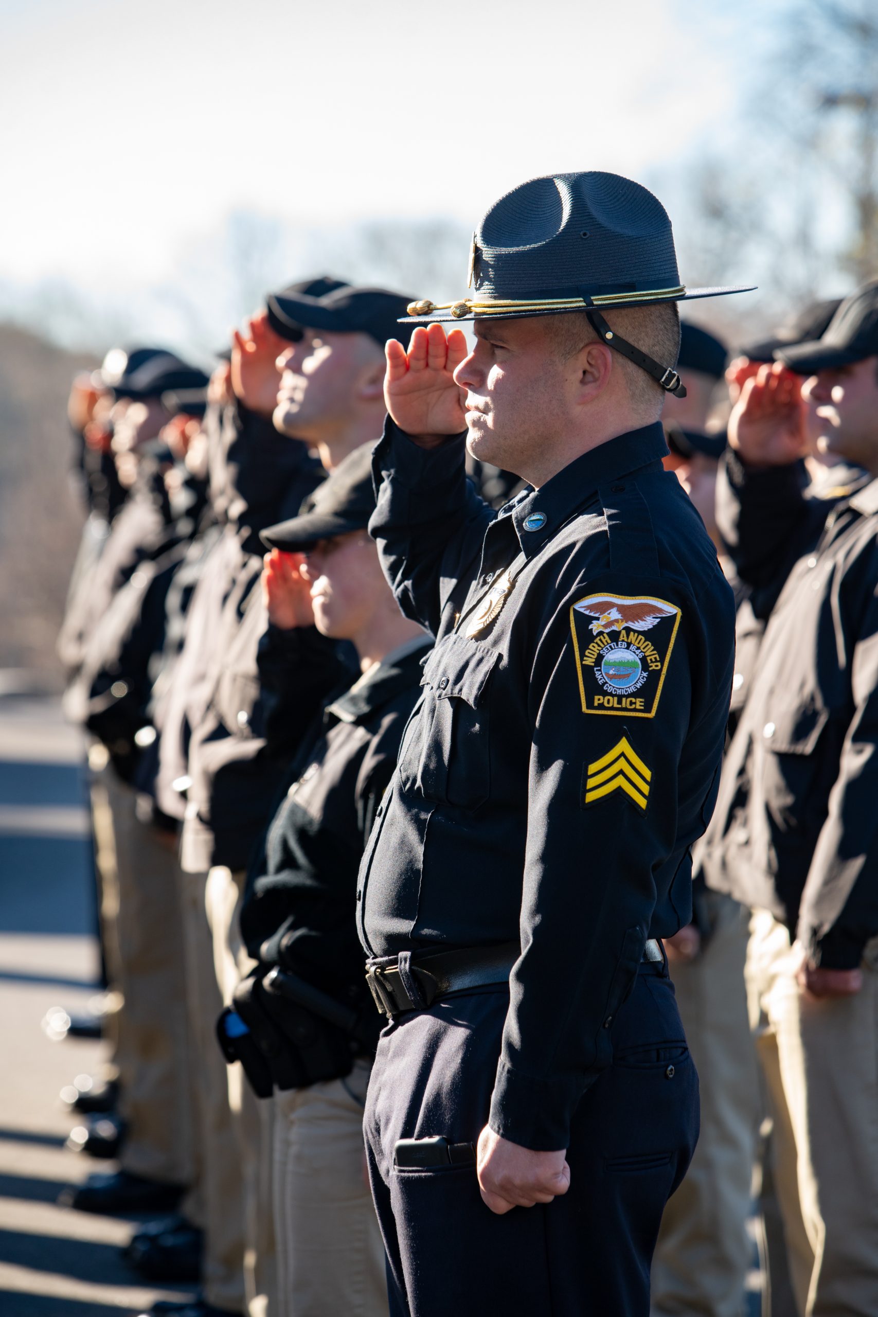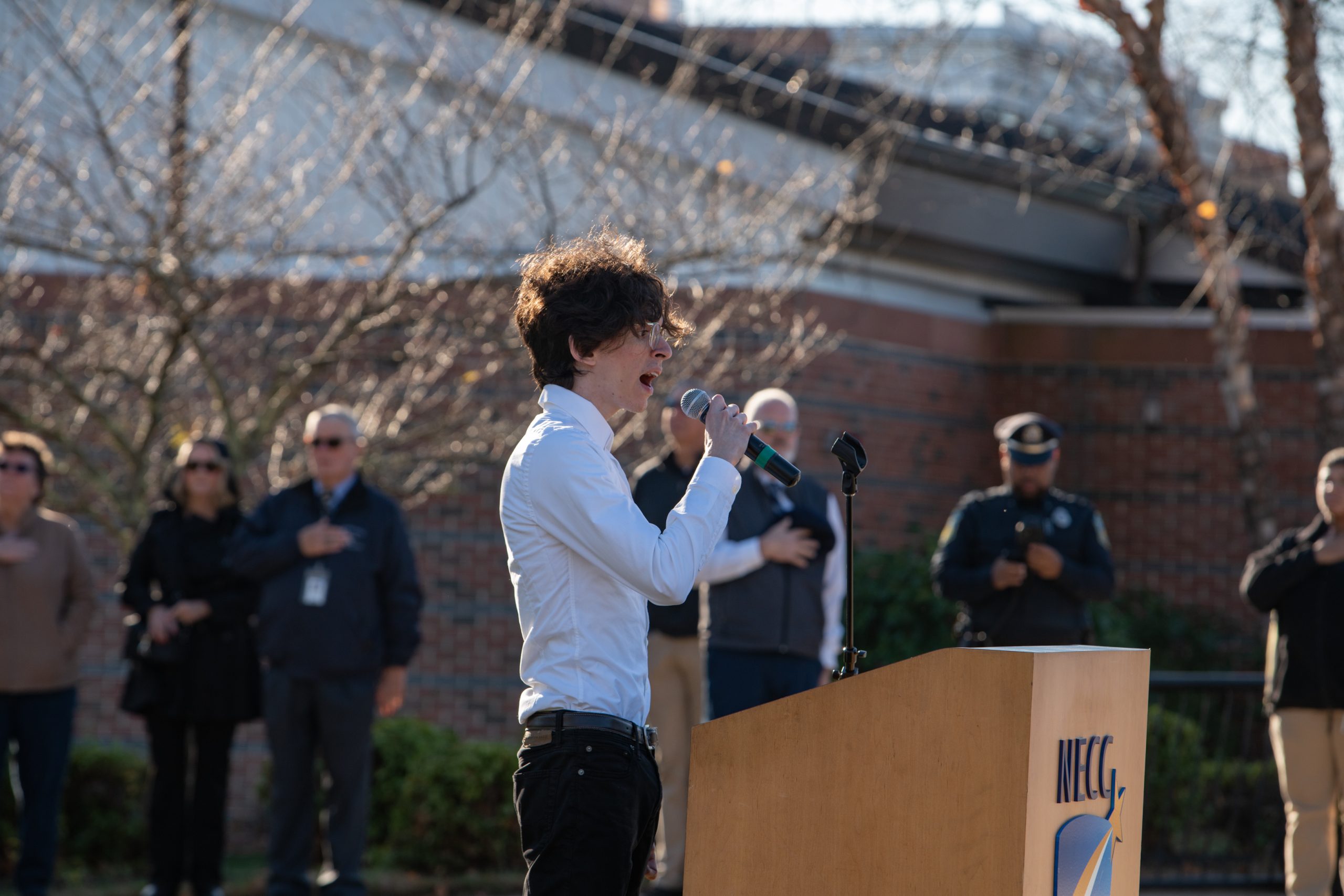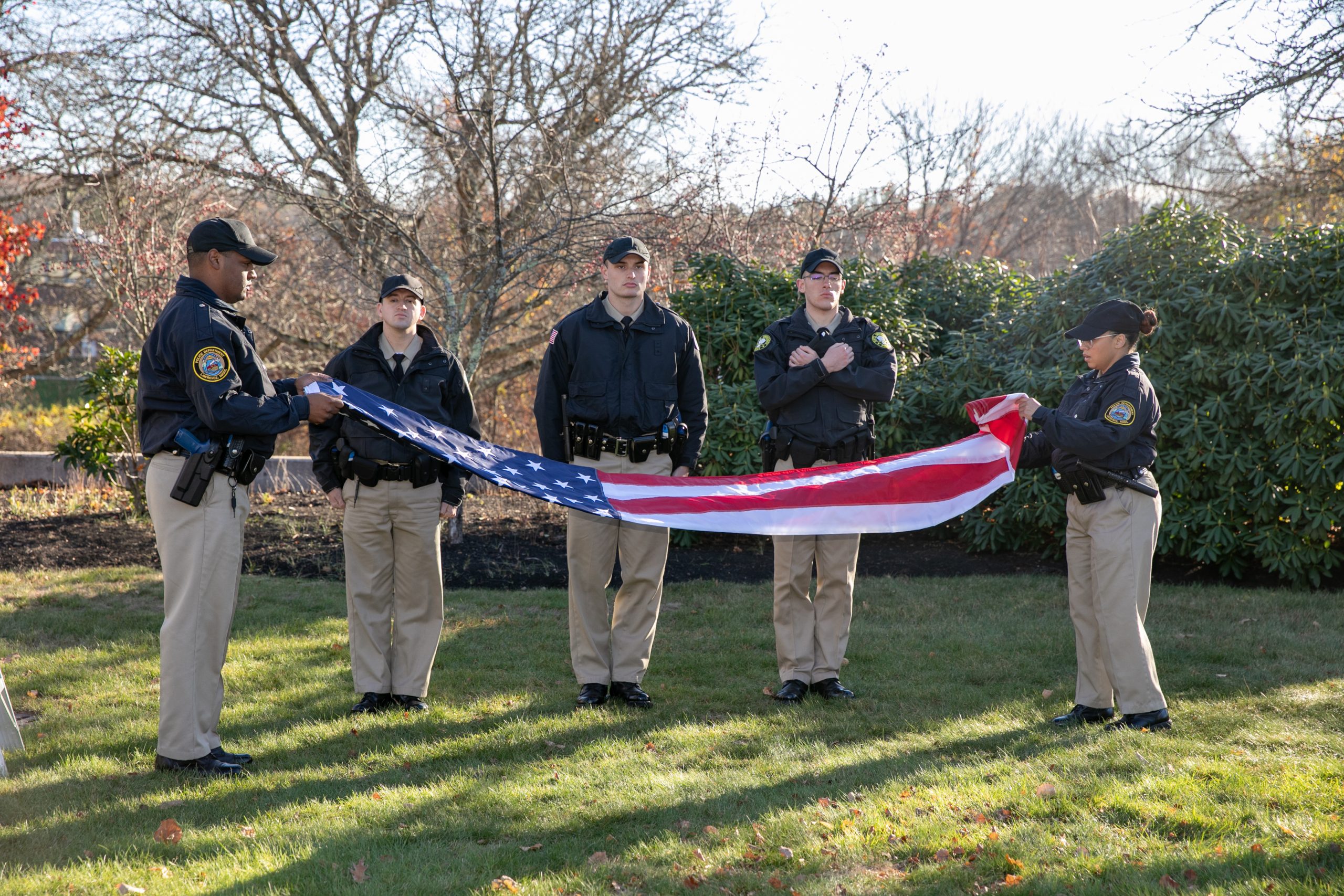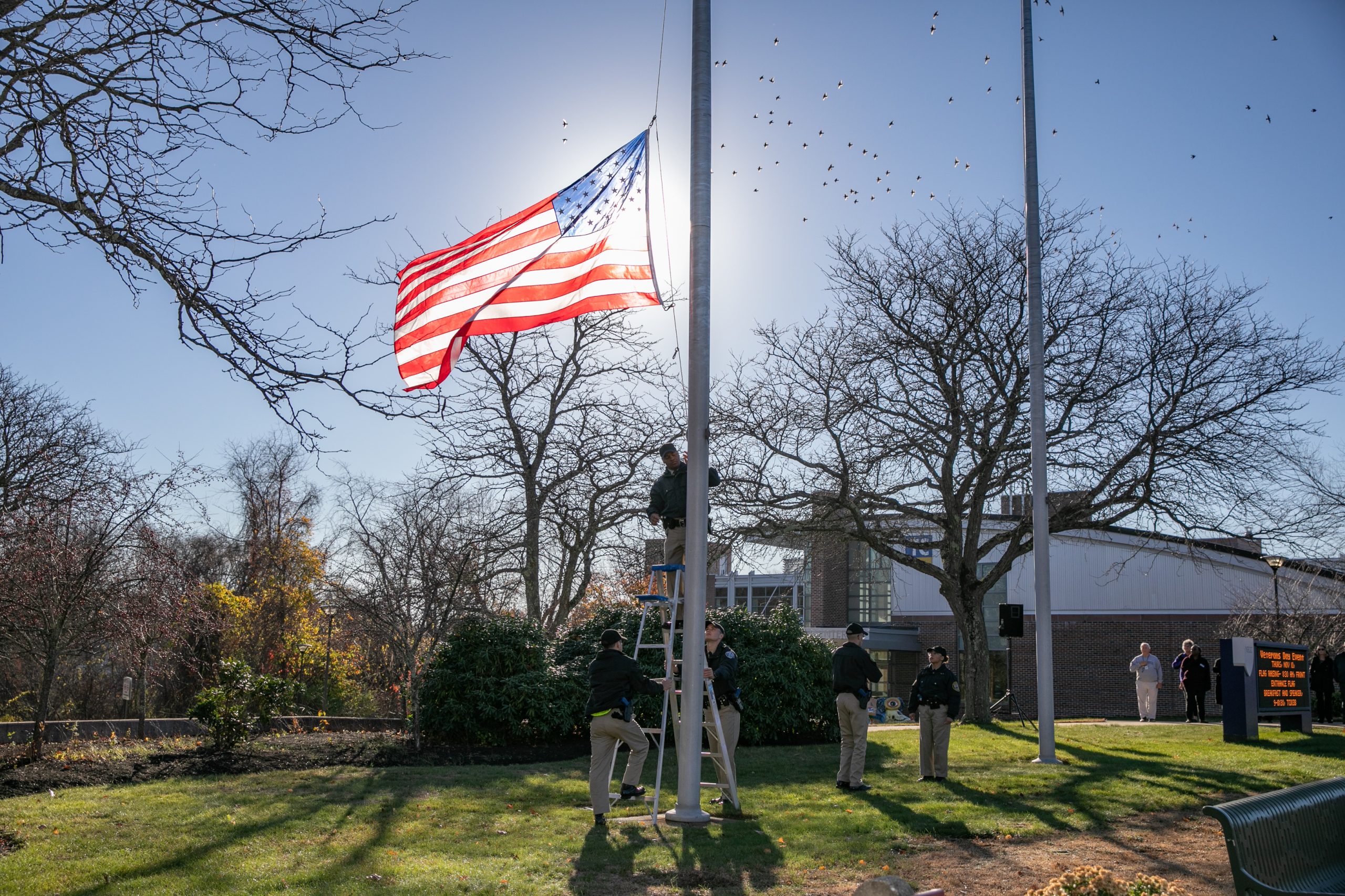 Haverhill, MA (November 10, 2022) – Northern Essex Community College paid tribute to veterans Thursday with a special event on the Haverhill Campus. Students and staff along with local leaders, law enforcement, and military members came together for a flag-raising ceremony. The program featured Northern Essex Police Academy cadets, the National Anthem sung by NECC music major Ben DiTomaso, and “Taps” played by professional trumpeter Art Zavarella.